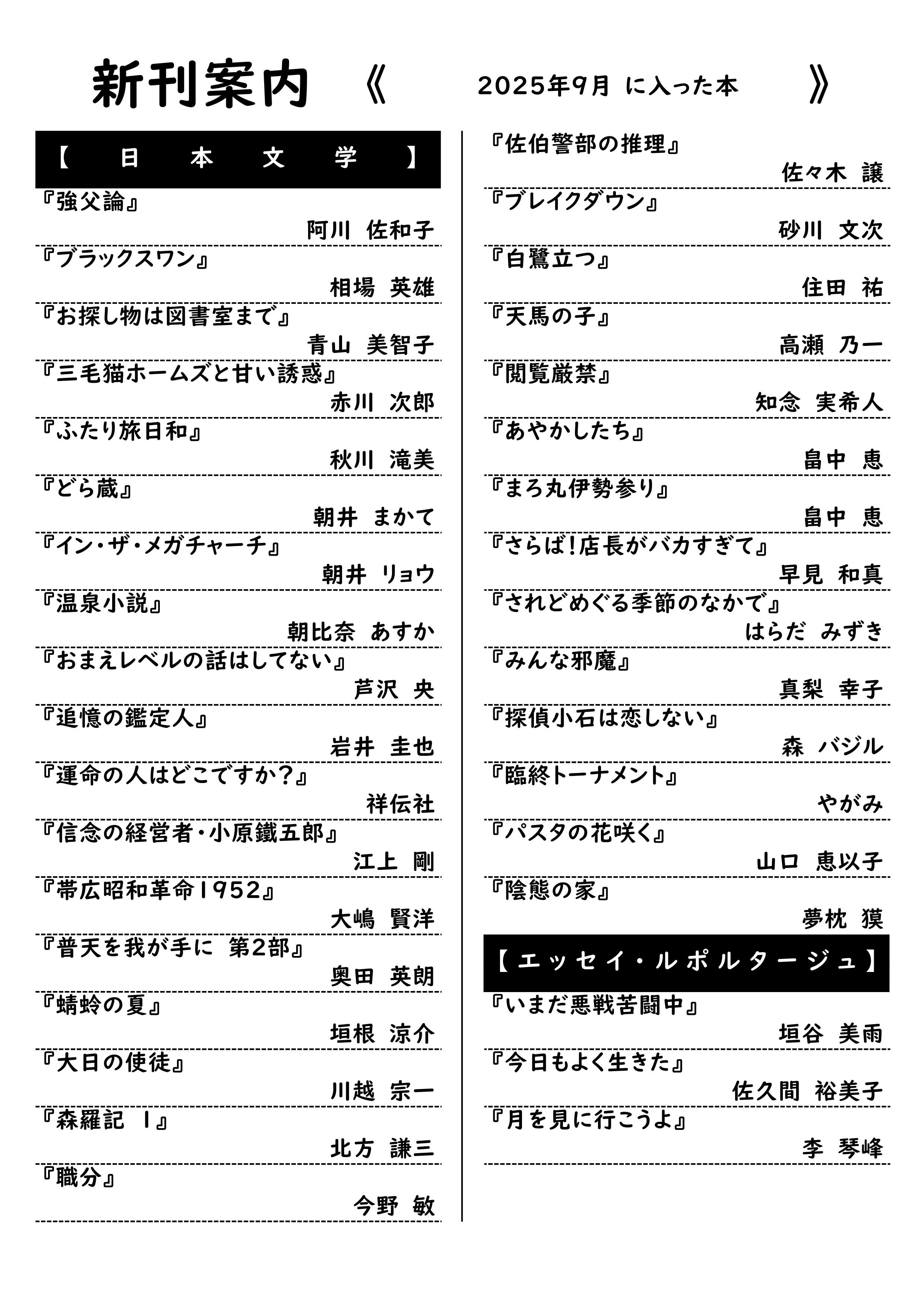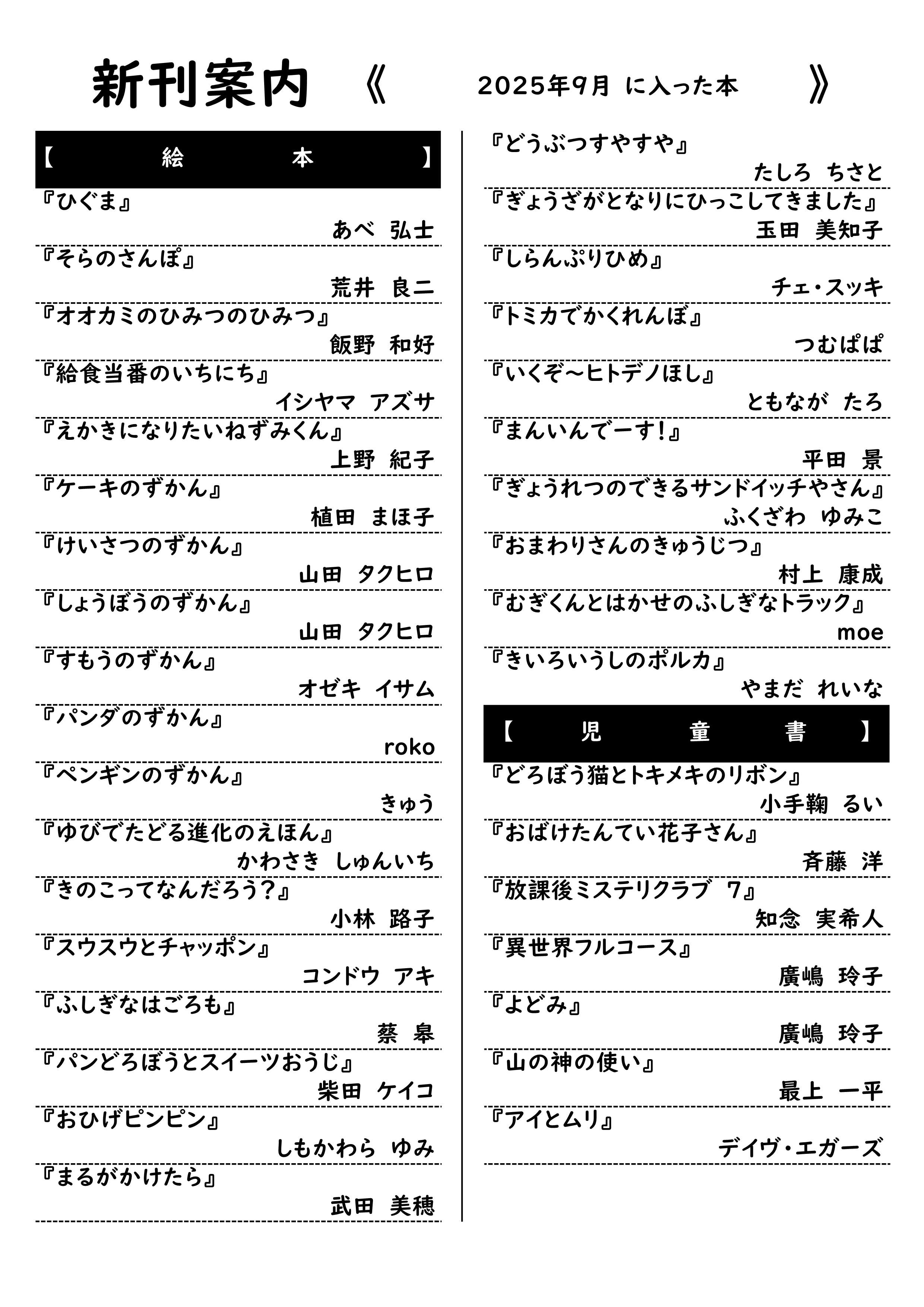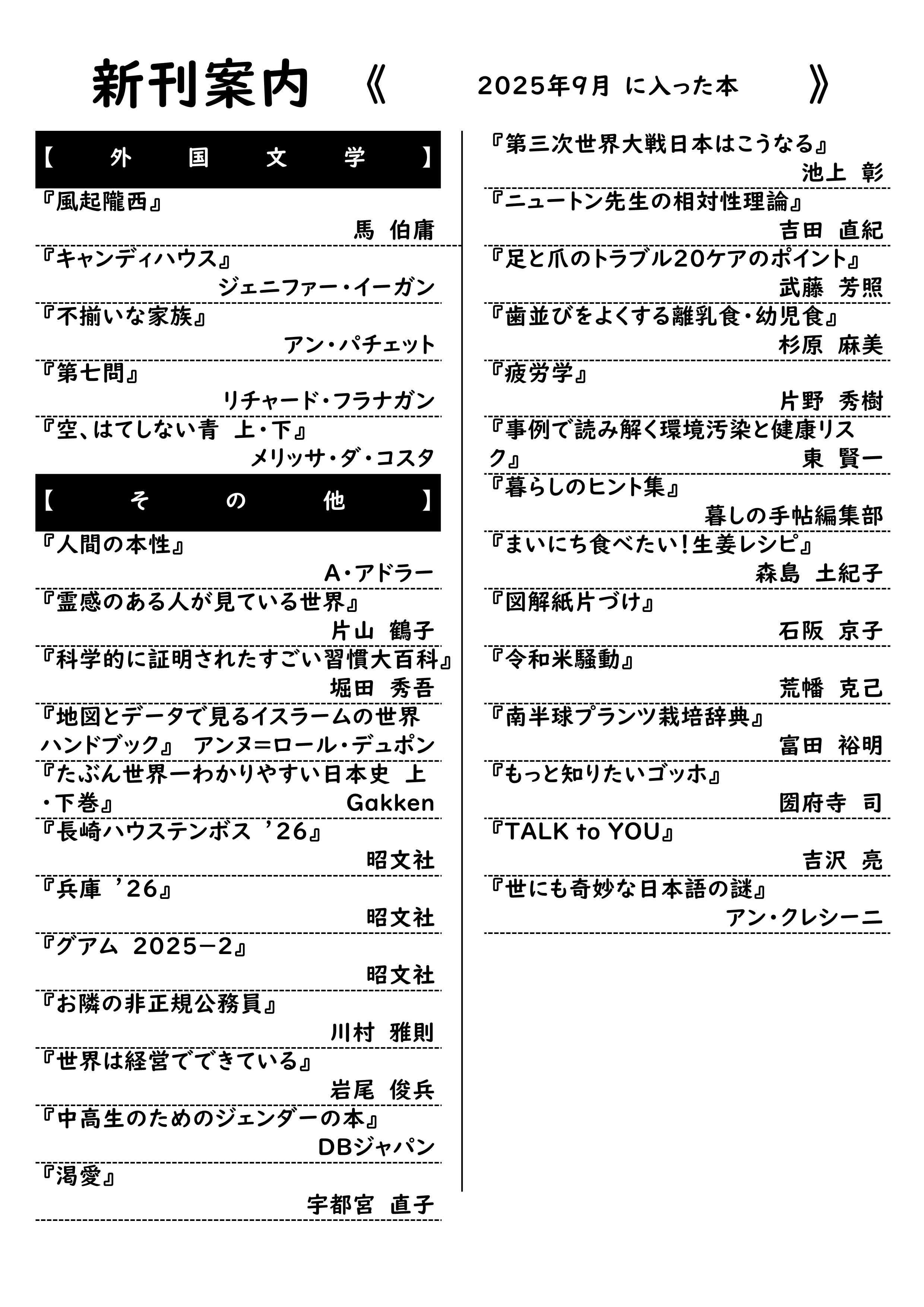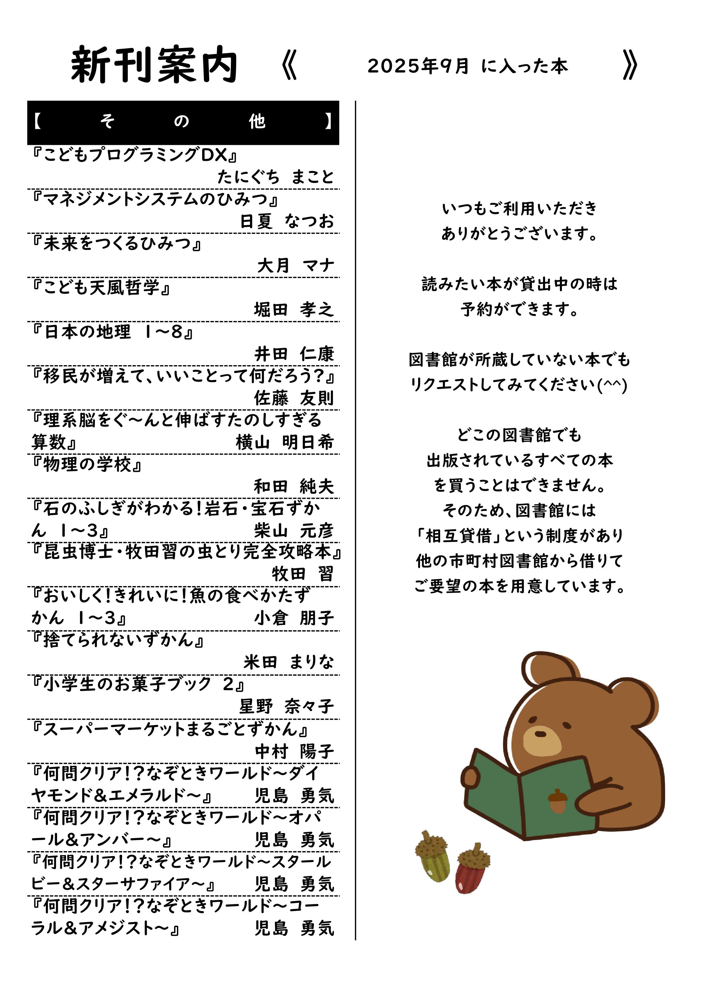 トップページ 子育て・教育 図書館 新刊案内【9/1から9/30までの入荷分】 新刊案内 2025年9月1日~末日までに蔵書とした資料をお知らせします。 子育て・教育 学校給食センター 図書館 スポーツ 学校教育 生涯学習 子育て支援・相談 子ども・家庭の手当・助成 保育所・認定こども園 母子保健 コミュニティ・スクール(学校運営協議会) 小中学校 高等学校 公園 こども家庭センター こども発達相談センター かんたん検索 税金・届出・証明 転入・転出 結婚・離婚 住まい ごみ・リサイクル 子育て・教育 健康・医療 福祉・介護 おくやみ 防災