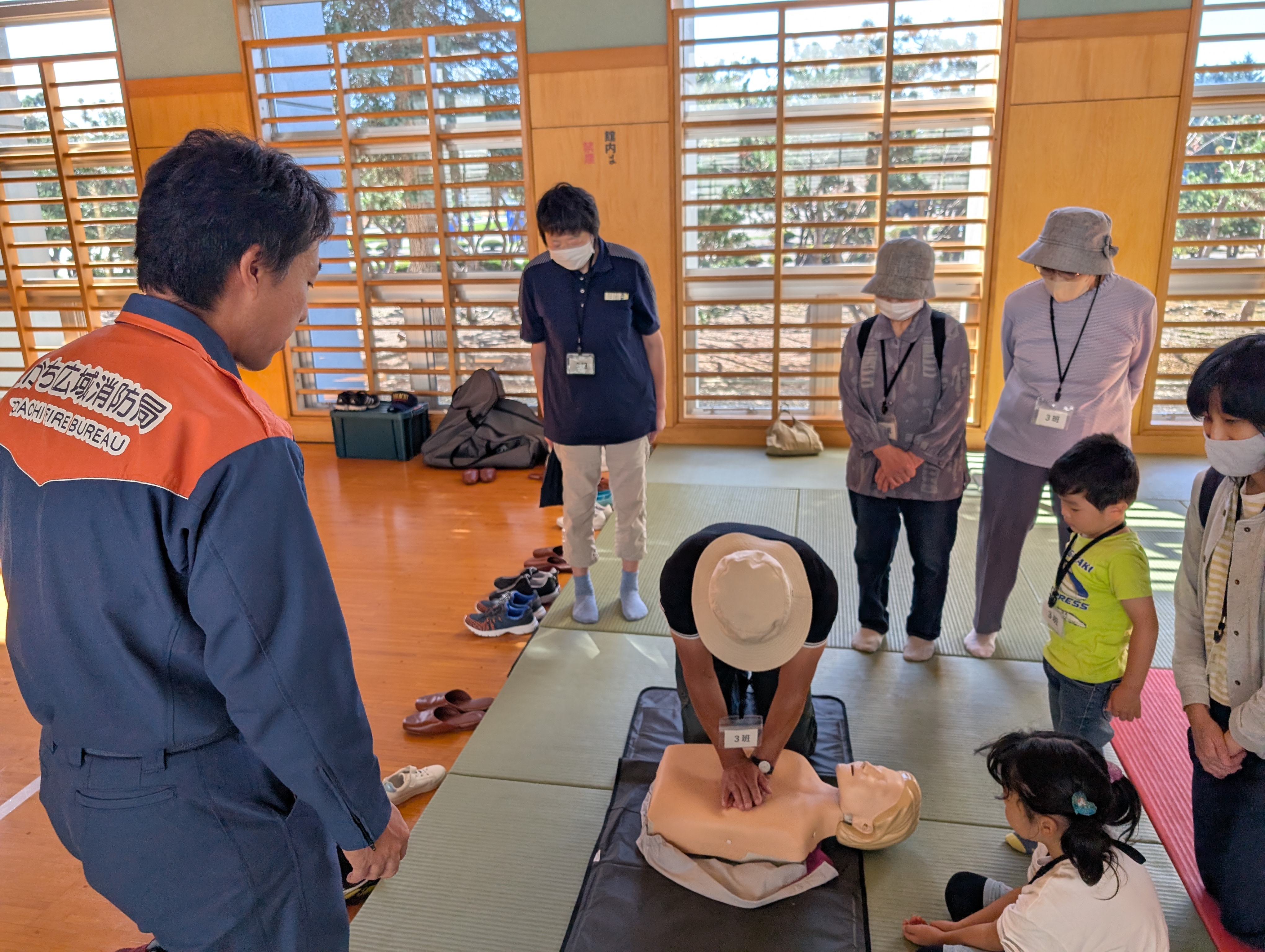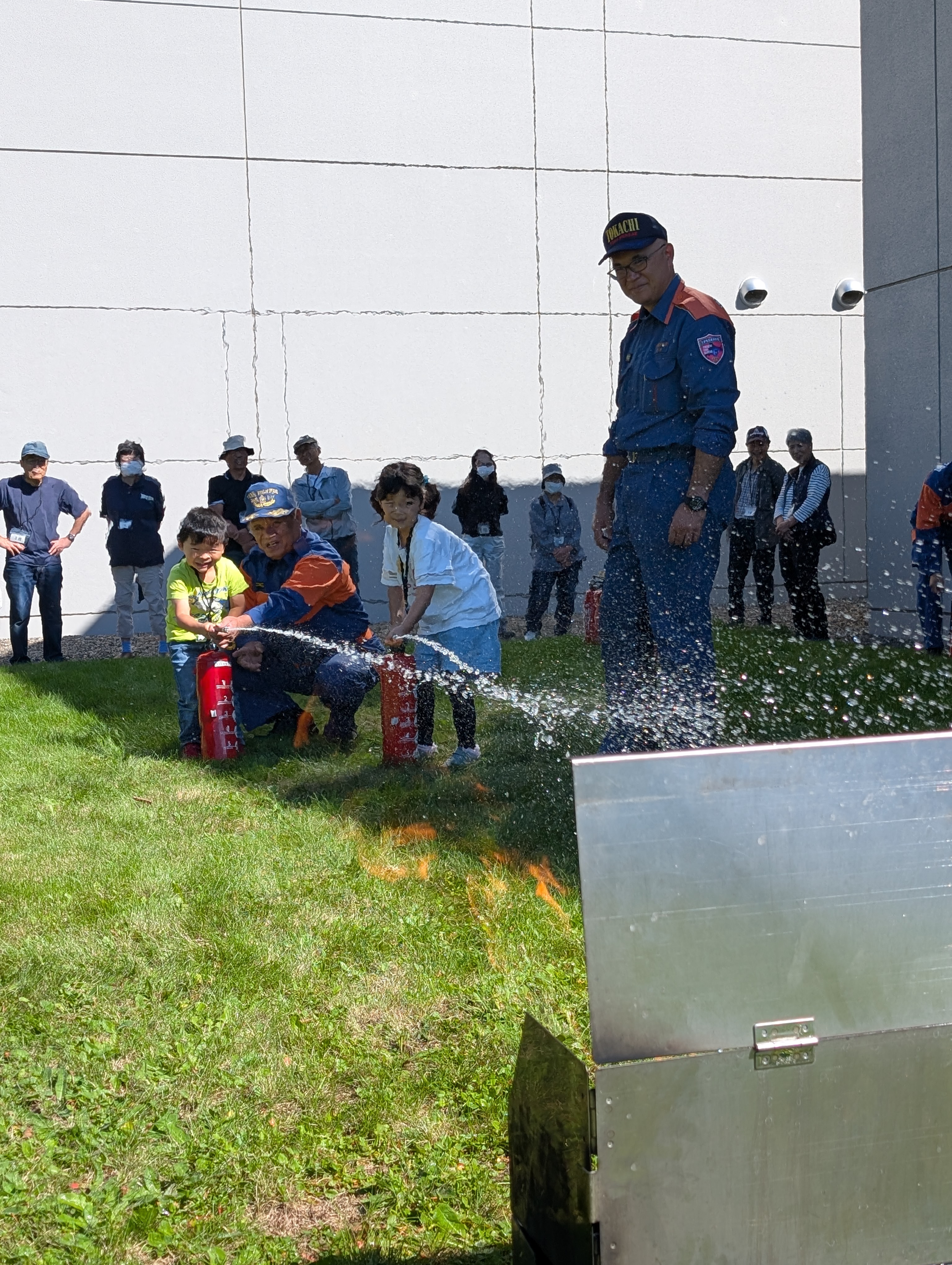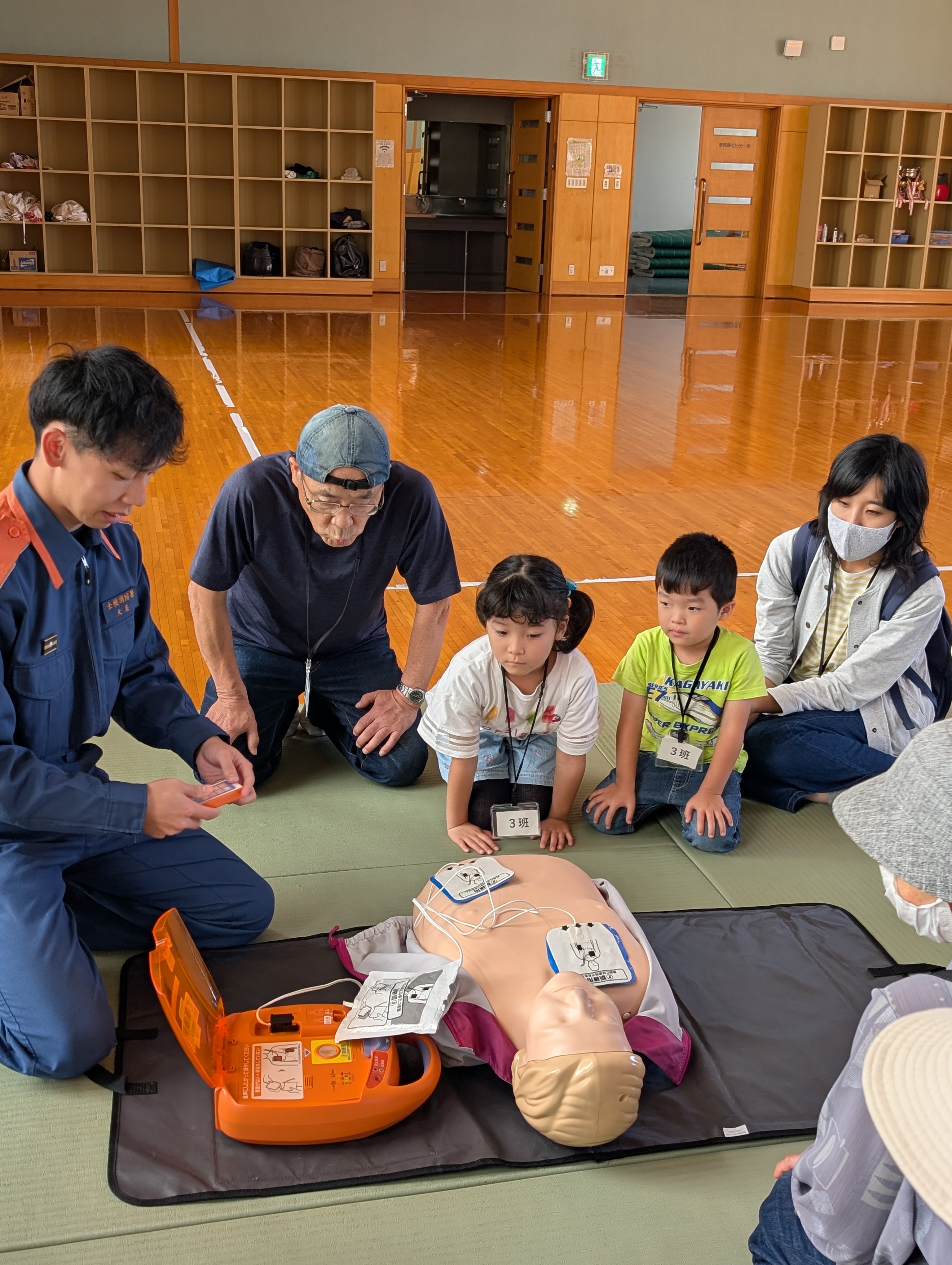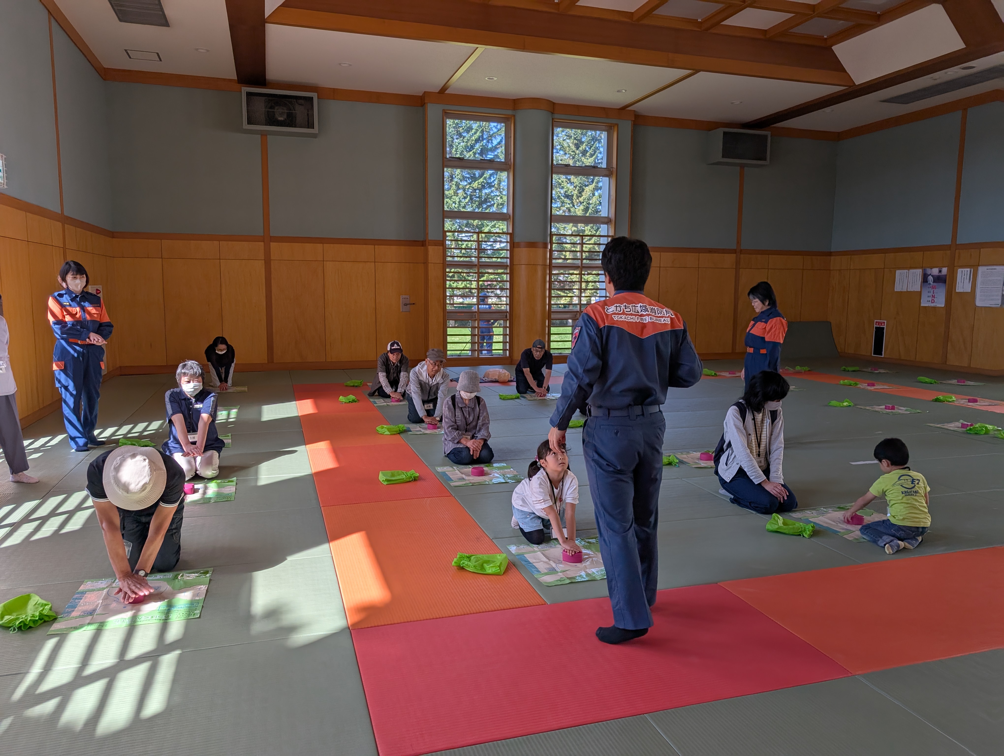 当日は子供から高齢者まで幅広い世代の方に参加していただき、町の指定避難所である総合研修センターにおいて、救急救命要領、消火要領および避難所の開設要領を体験いただいた後、町の他、防災関係機関、関係事業所などのご協力をいただき展示しました災害対応資機材や車両等を見学していただきました。