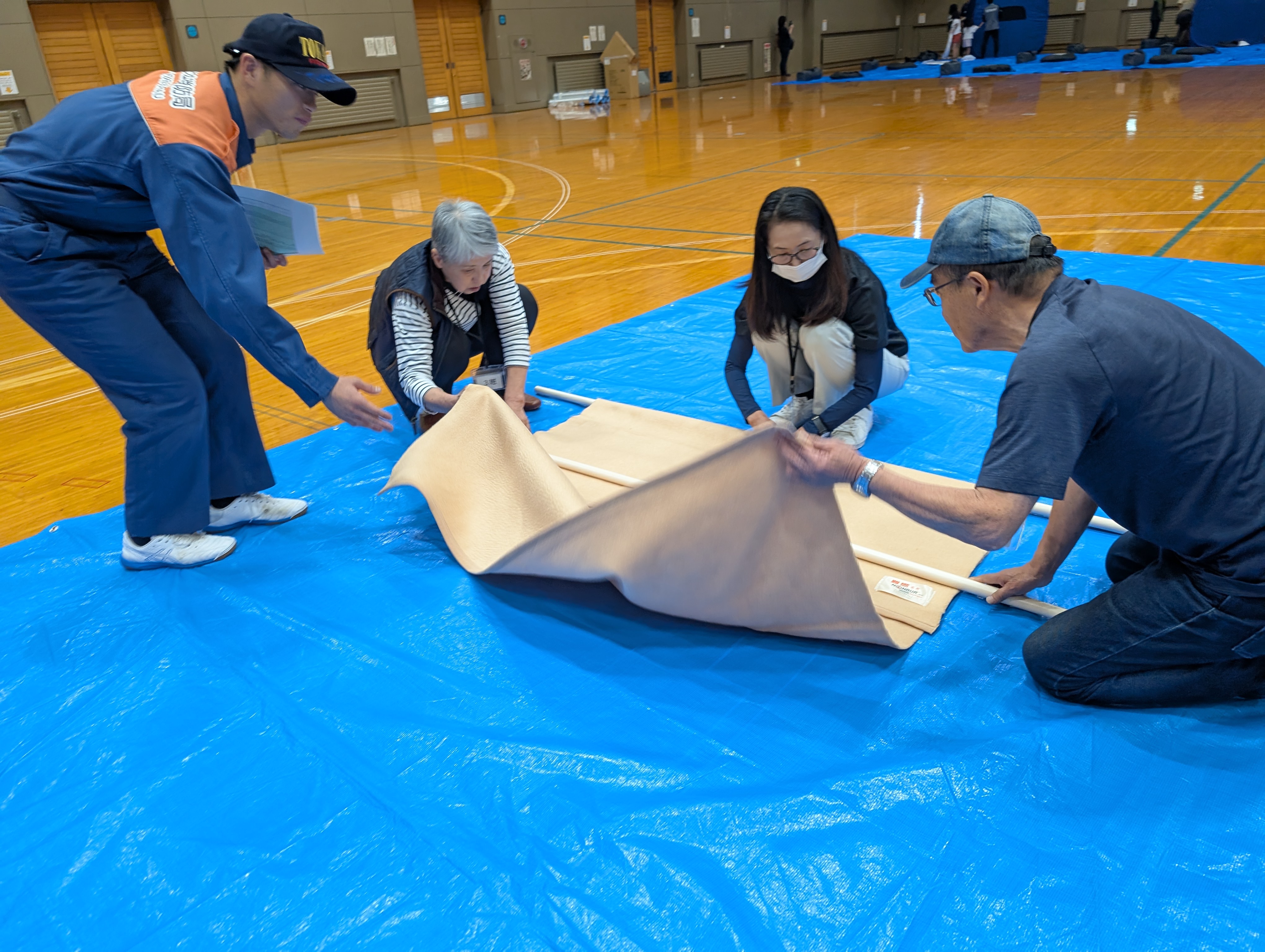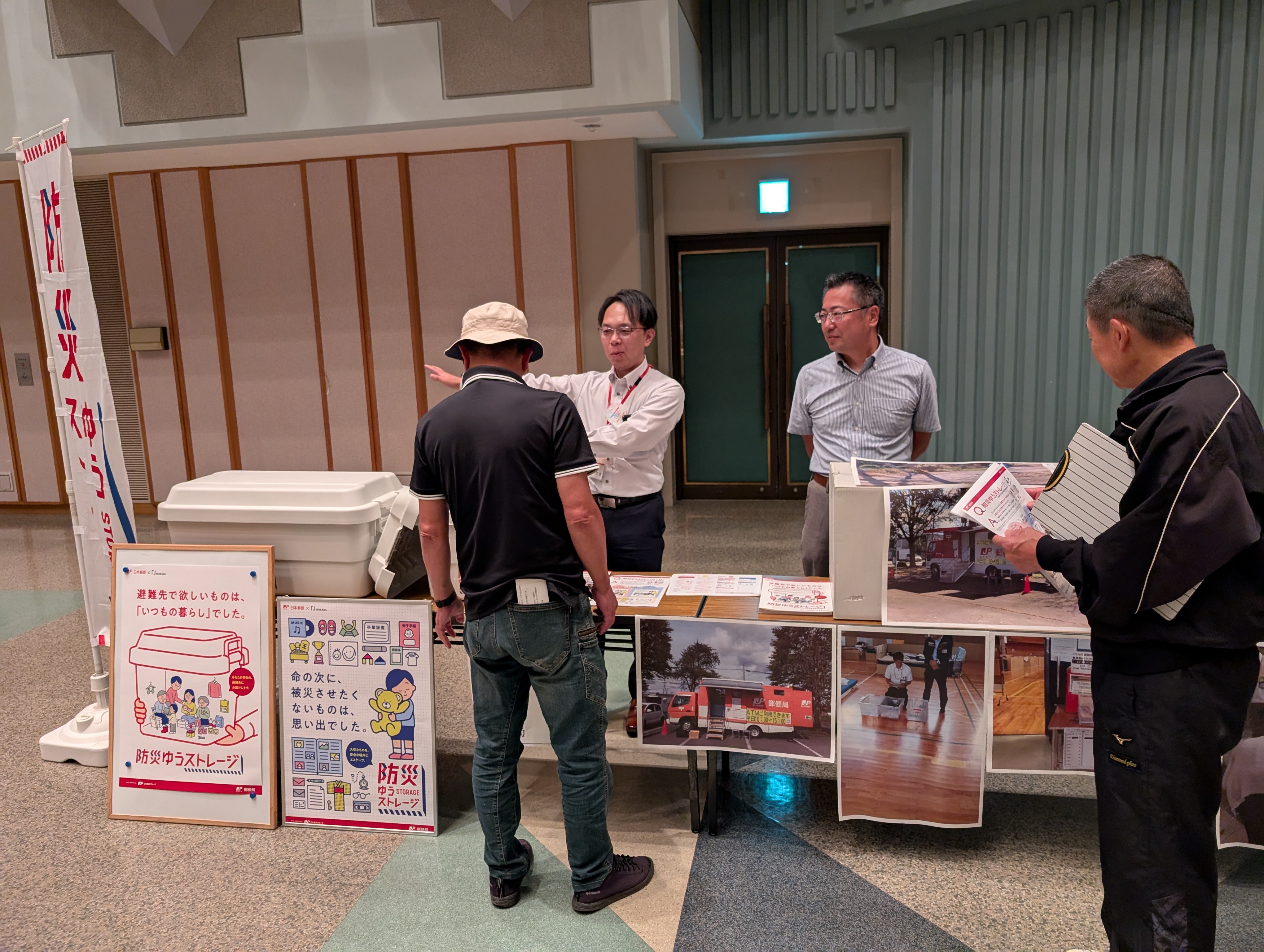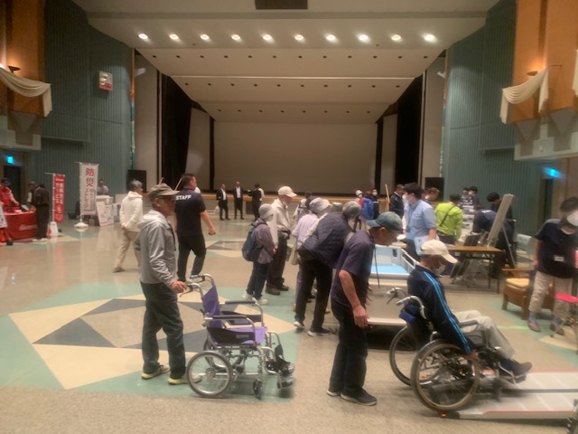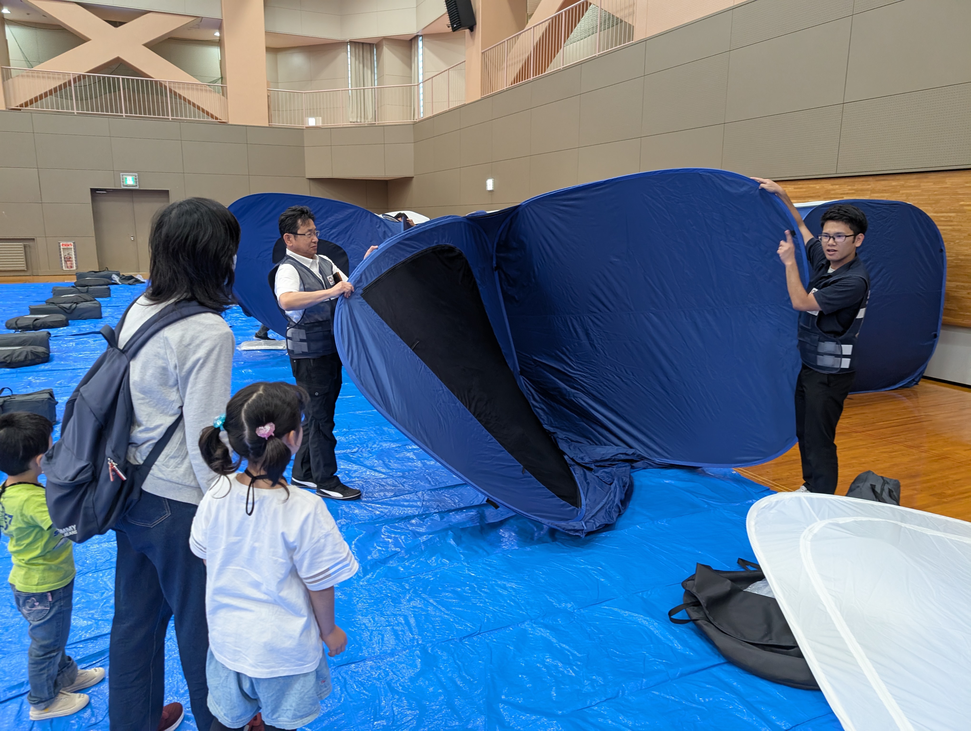 当日は子供から高齢者まで幅広い世代の方に参加していただき、町の指定避難所である総合研修センターにおいて、救急救命要領、消火要領および避難所の開設要領を体験いただいた後、町の他、防災関係機関、関係事業所などのご協力をいただき展示しました災害対応資機材や車両等を見学していただきました。