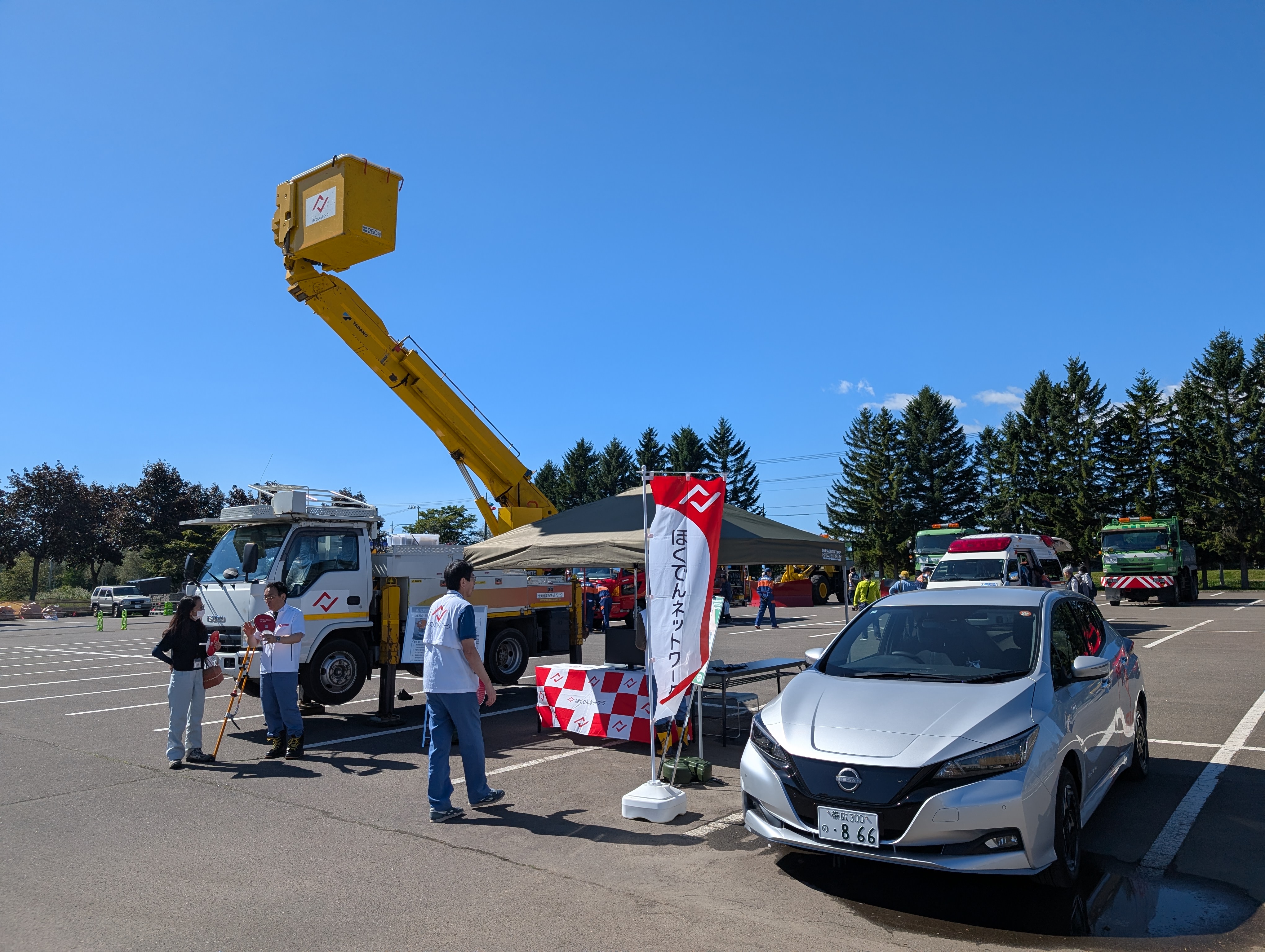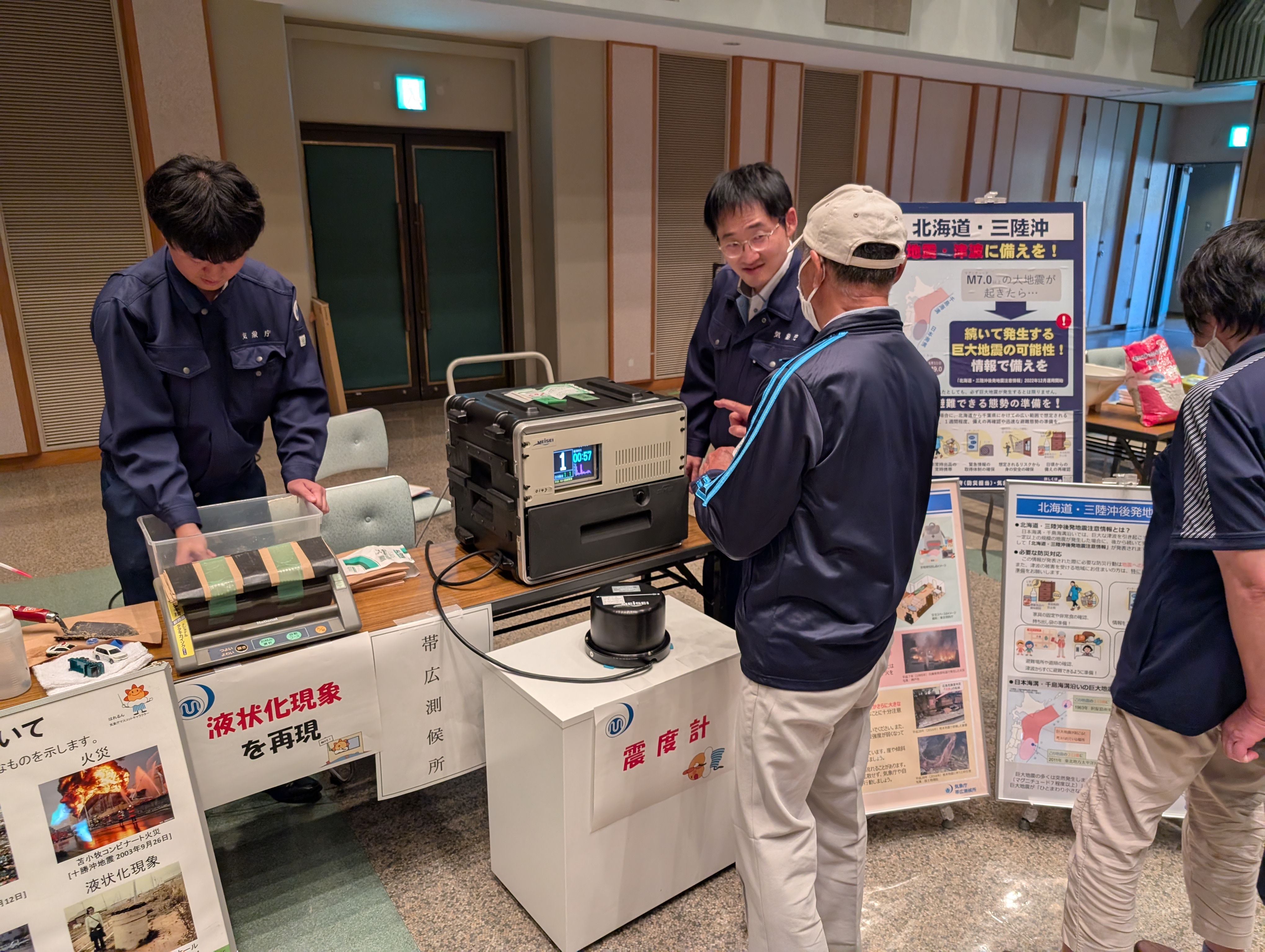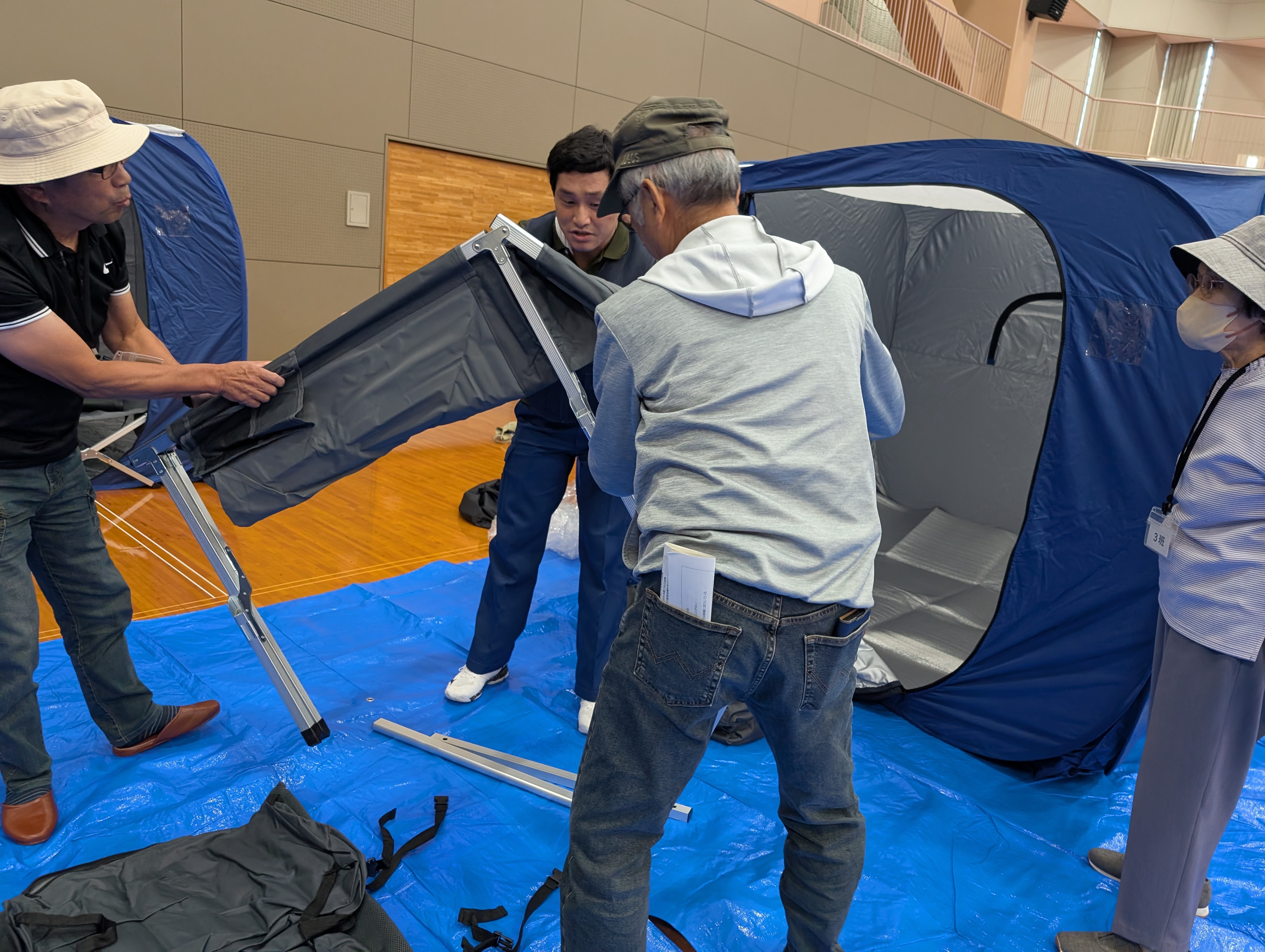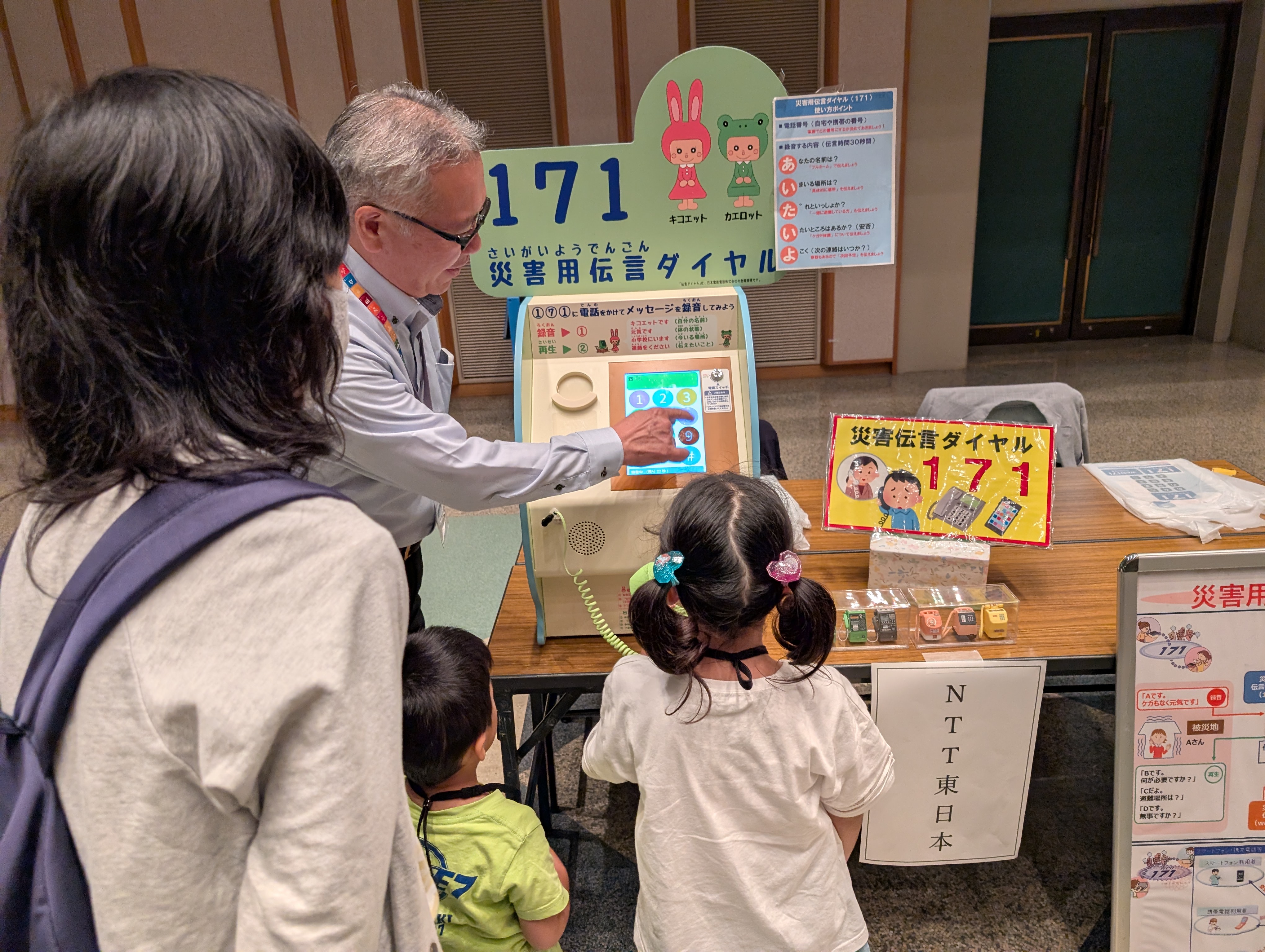 当日は子供から高齢者まで幅広い世代の方に参加していただき、町の指定避難所である総合研修センターにおいて、救急救命要領、消火要領および避難所の開設要領を体験いただいた後、町の他、防災関係機関、関係事業所などのご協力をいただき展示しました災害対応資機材や車両等を見学していただきました。